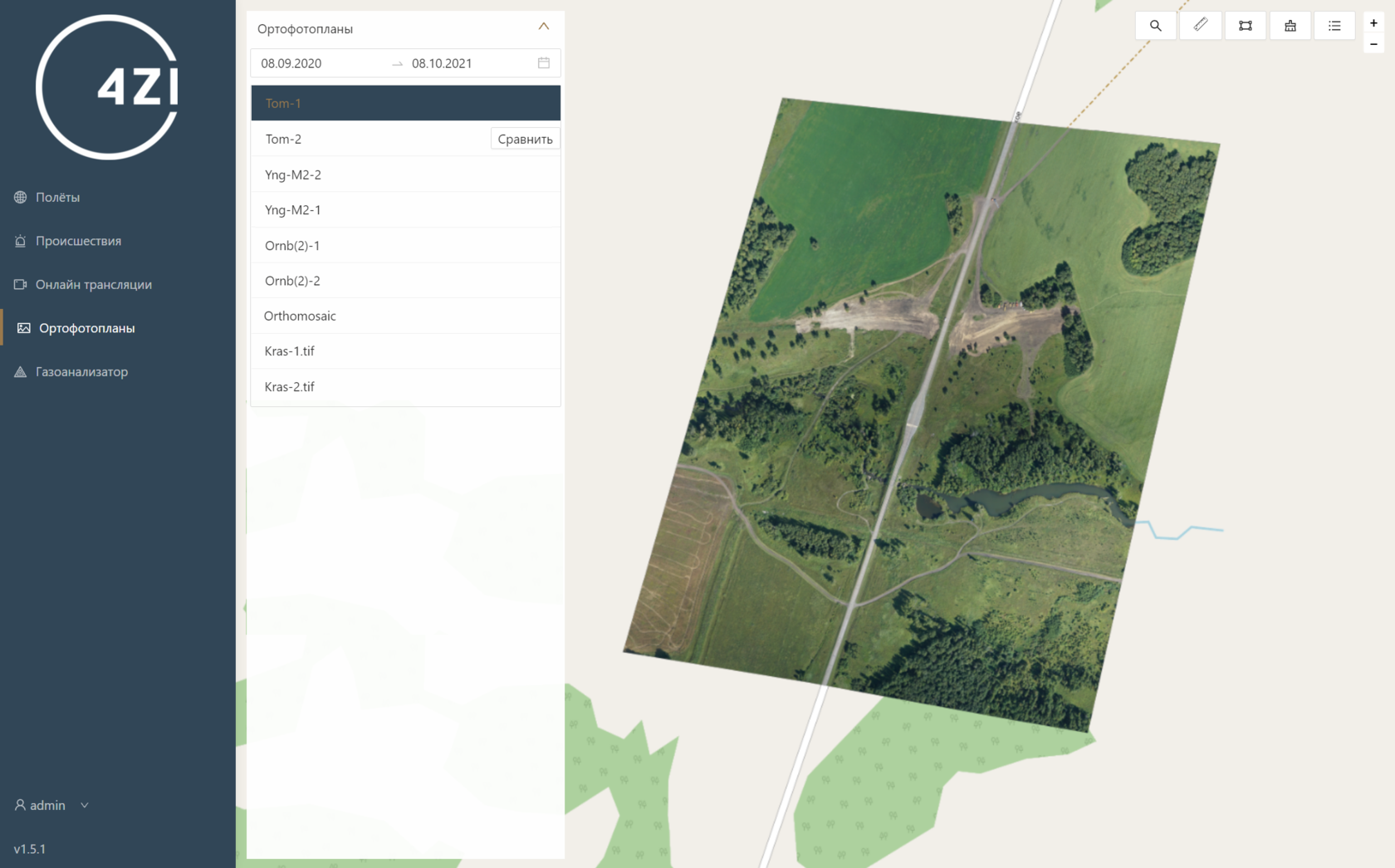 The module is designed for storing and analyzing area orthomosaics of any size, laying them over a map, measuring various objects, exporting data, and visually comparing several orthomosaics of the same area taken at different times.